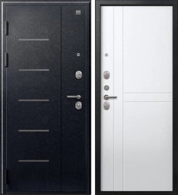 Надежная входная Дверь V-06 Черный муар - Белый премиум класса по цене 38 285 руб. Большая толщина стали защитит от проникновения в ваш дом, квартиру или коттедж. Используется очень качественная фурнитура: замки, цилиндры, ручки, защелки. Покрытие и отделка двери изготовлено под внимательным контролем производителя. Дверь имеет долгий срок службы и гарантию.